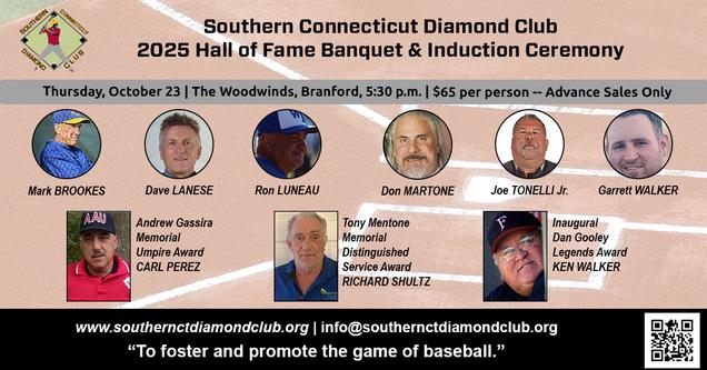 The Southern Connecticut Diamond Club, Inc., will hold its 17th Annual Hall of Fame Banquet and Induction Ceremony on Thursday, October 23, 2025, at The Woodwinds in Branford.